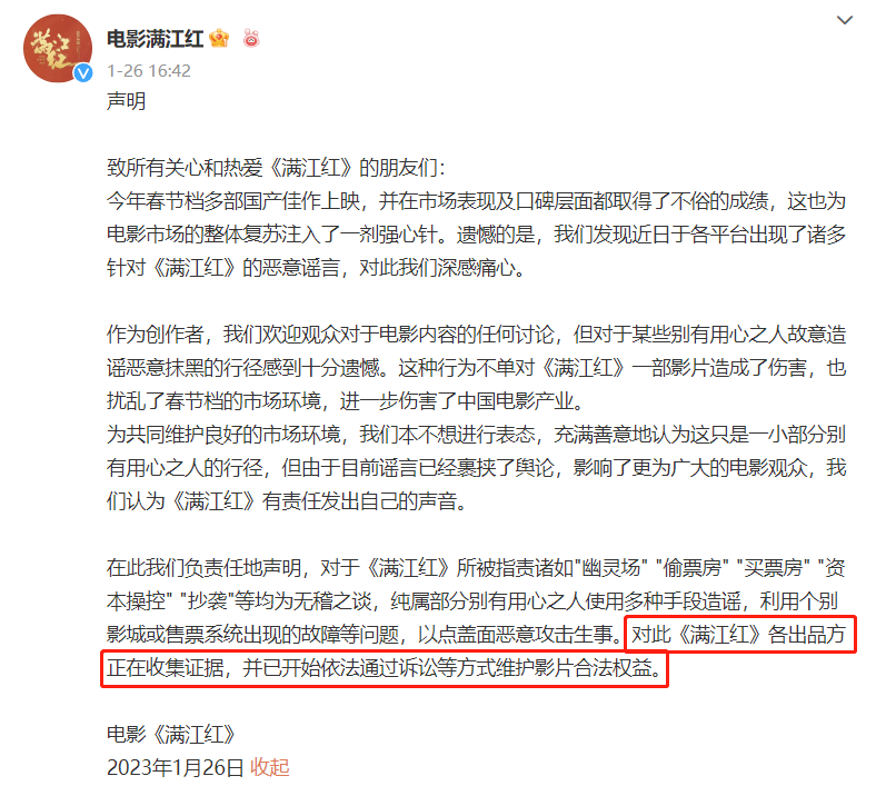 满江红片方提出的是,自媒体大V侵犯电影名誉权,只需要将电影名誉权相关证据拿出来即可。这很容易做到,就是保存自媒体大V说满江红票房造假的图文链接就行了。