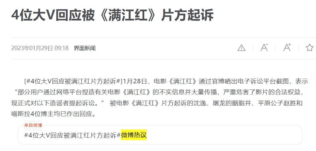 满江红片方起诉自媒体大V造谣,称其侵犯了满江红电影的名誉权,而自媒体大V大方回应:“积极应诉,等法院见。”