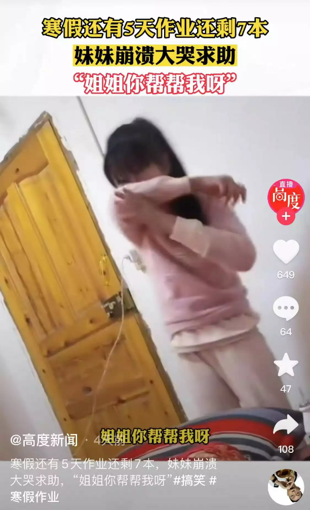还刷到个视频,姐姐看妹妹寒假玩得乐不思蜀,提醒妹妹寒假作业的事。妹妹这才发现假期余额不多,作业却还很多。