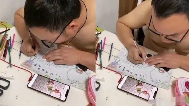 就连大部分时间都蹲厕所的老父亲,也顾不上自己的“自由”了,一笔一画做着娃的手抄报。