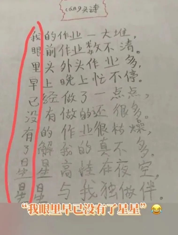 杭州一名小学生写作业效率太低了,被妈妈批了一顿,然后她就写了一首藏头诗:我的眼里早已没了星星。
